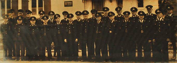 Des Weiteren zeigen wir Ihnen zwei Gruppenfotos der Belegschaft aus den 40er und 50er Jahren, sowie eine Ablichtung von diversen Ausrüstungsgegenständen und Einsatzmitteln aus vergangenen Jahren.